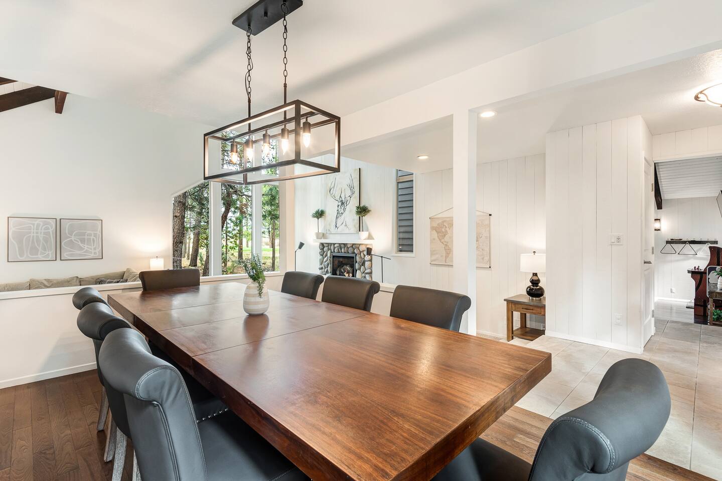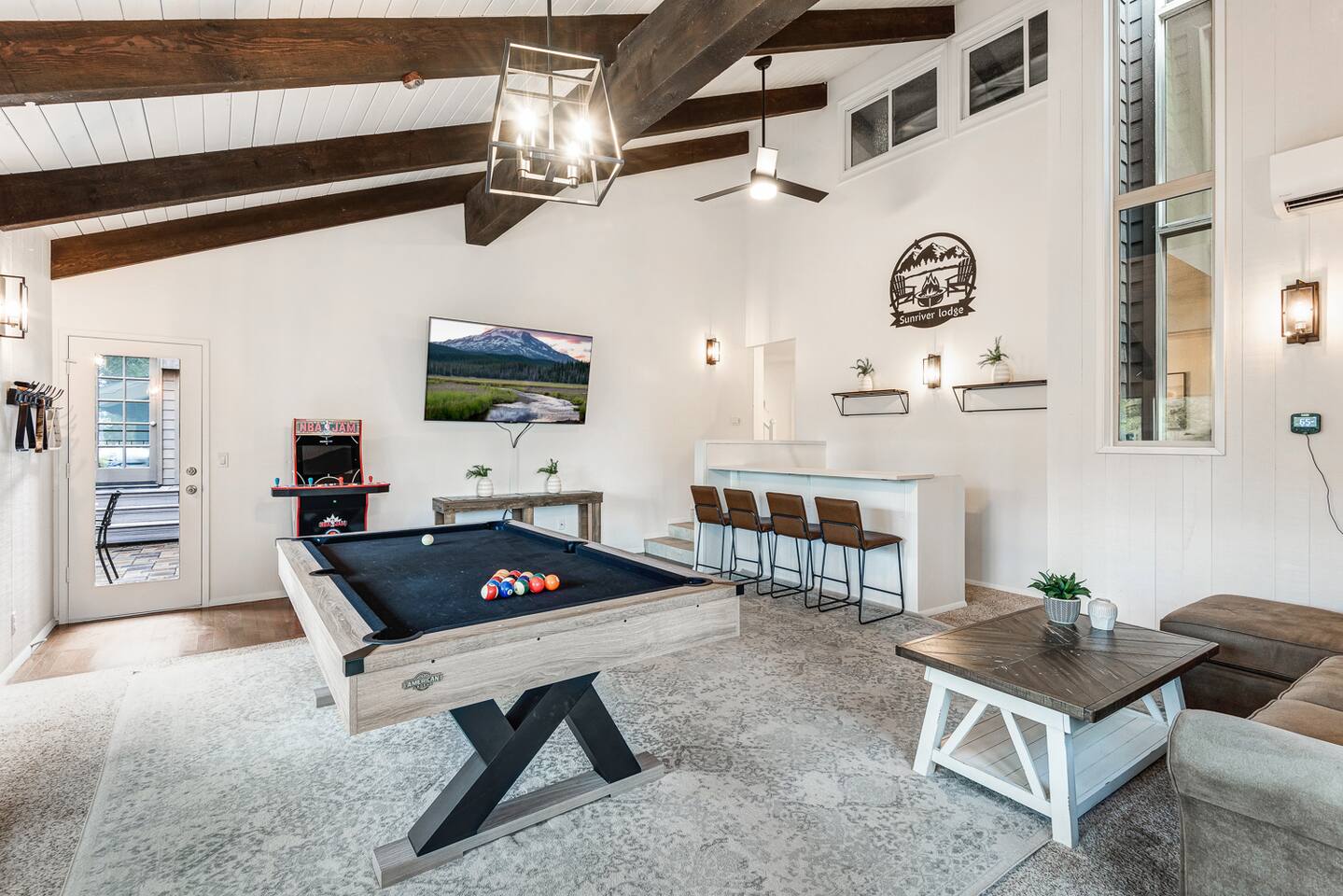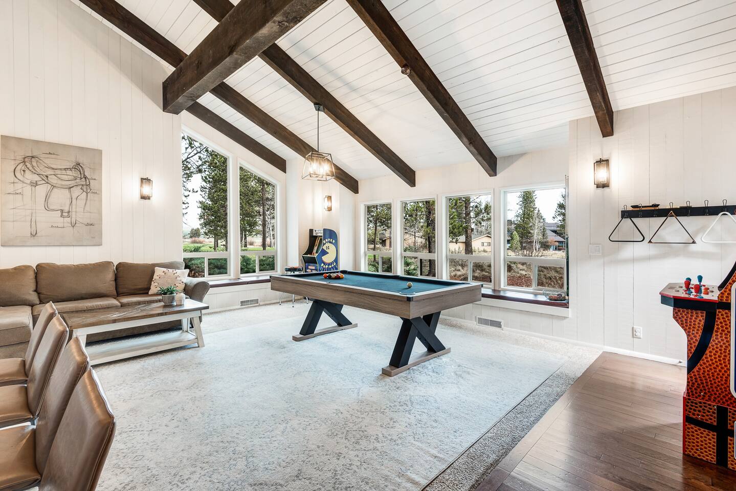Indoor Space: - 4,000 square foot home with updates throughout. - Sleeps 26 people. 6 bedrooms (2 Kings, 4 Queens, double size bunk, twin size bunk). - 2 separate family rooms, including a game room with 75” TV, pool table, arcades, and a bar for the louder kids or adults, and a separate living room with a fireplace for the more relaxed ones. - Indoor hot tub with beverage cooler and access to one of the downstairs bathrooms. - 2 bathrooms downstairs, one upstairs. - Large updated kitchen and separate dining room for large groups. Outdoor Space - Large paver patio with barbecue overlooking the 6th tee of the Meadows golf course. On the golf course for an amazing view but sits back from the course a bit for privacy and out of the way of stray golf balls. - Excellent spot for kids to play in the snow on the golf course in the winter, or to go cross country skiing or snowshoeing! Other Amenities - 10 passes to the Sunriver SHARC water park included! - Lots of bikes and sleds are provided. - All bedrooms have smart TVs for streaming devices for you to use your favorite streaming service. - Separate AC/heat controls for upstairs, downstairs, and game living room.