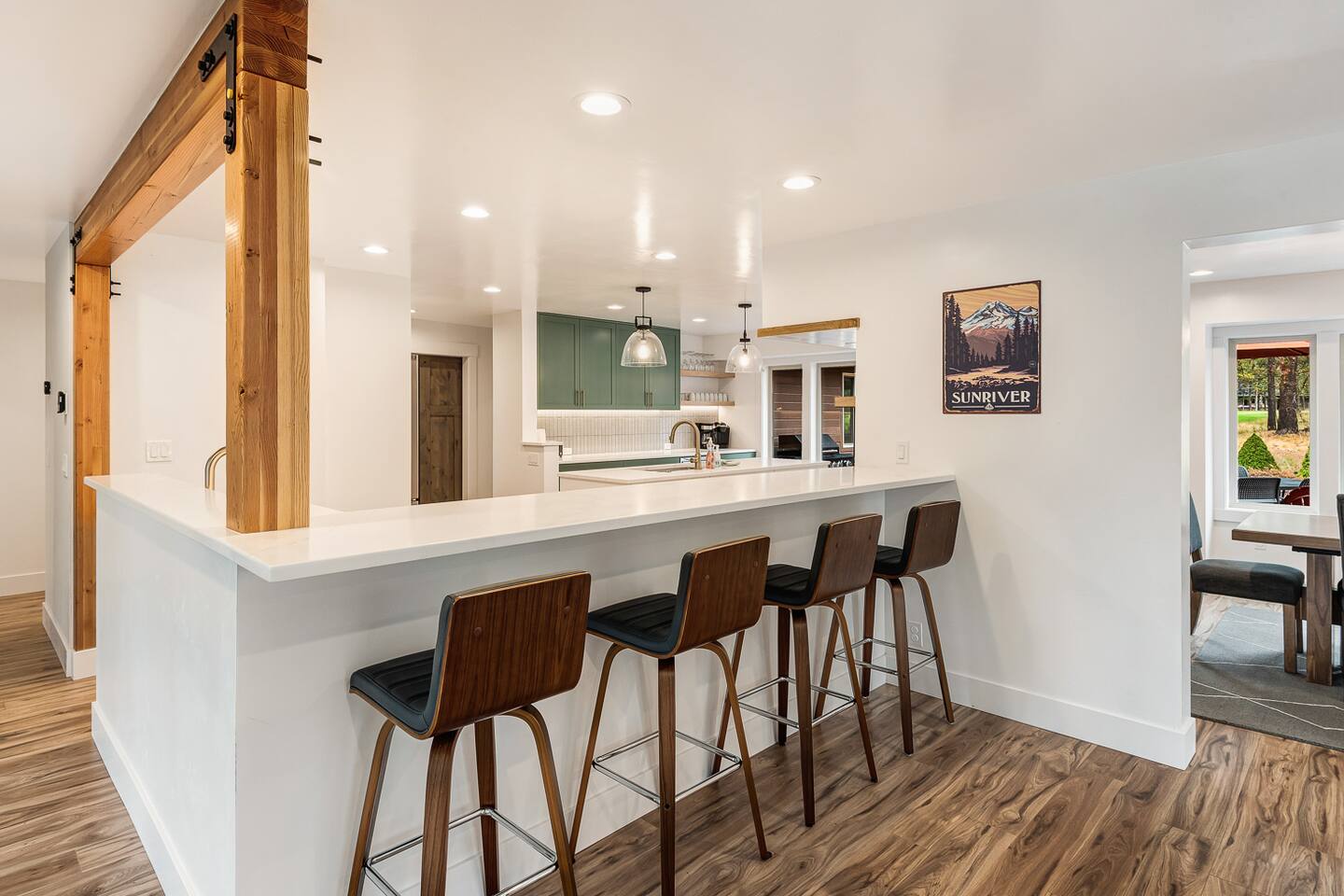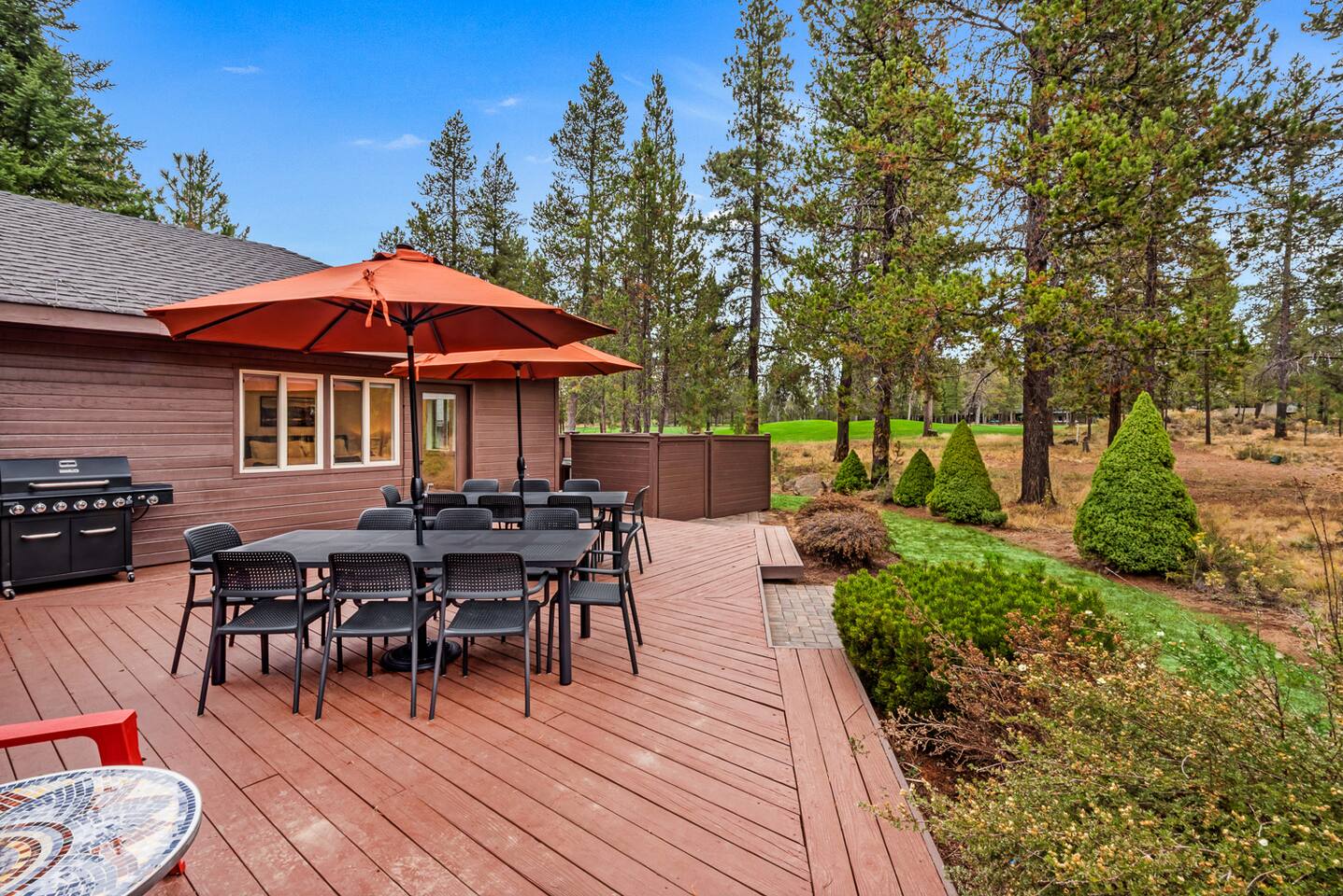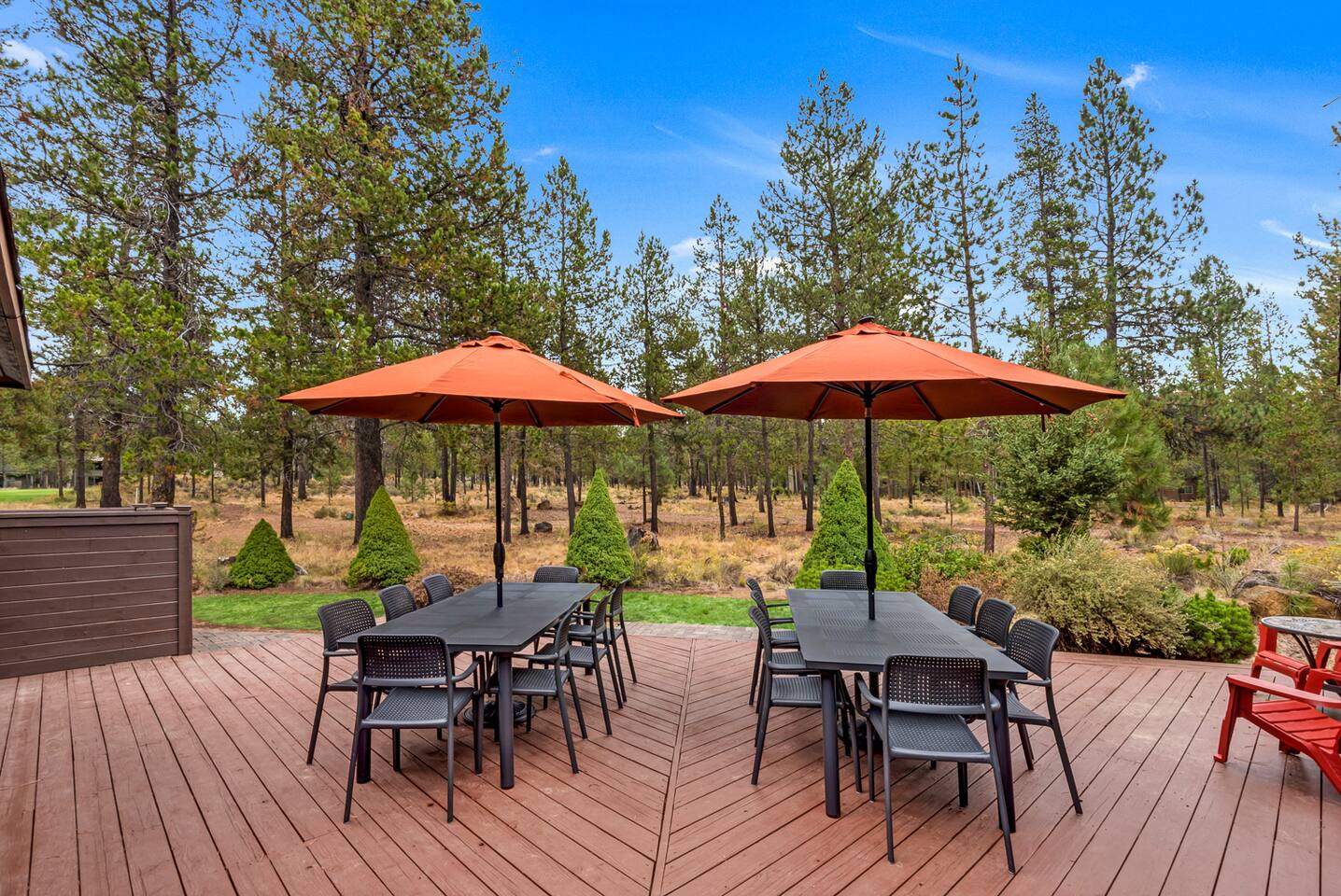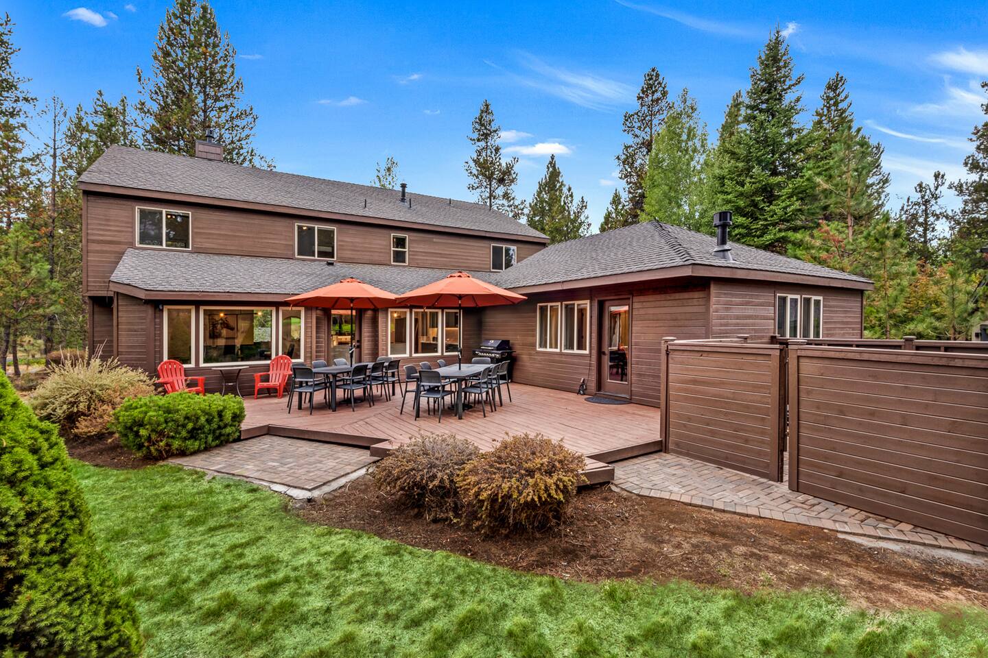 - Hot tub fully drained and refilled with fresh water between EVERY guest stay. - Gorgeous home, fully updated from top to bottom in an excellent central Sunriver location. - Short walk or bike ride to Fort Rock Park. - 5-minute drive to the Woodlands Golf Course, Sunriver Village for coffee, food, ice cream, and entertainment. - 10-minute bike ride (5-minute drive) to the Sunriver SHARC water park. - 2 separate dining rooms for large gatherings. - Golf course and forest views from house!
